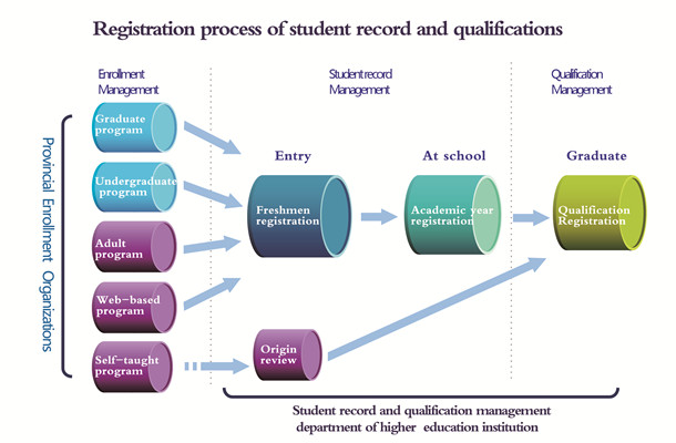 In China higher education qualification certificate (including Zhuanke, undergraduate, master, and doctoral levels) registration, there is a whole-process dynamic management, beginning with admission records, going with freshmen student record registration, then with in-school student annual registration, and finally leading to qualification registration, in which each step should be based on the prior one.